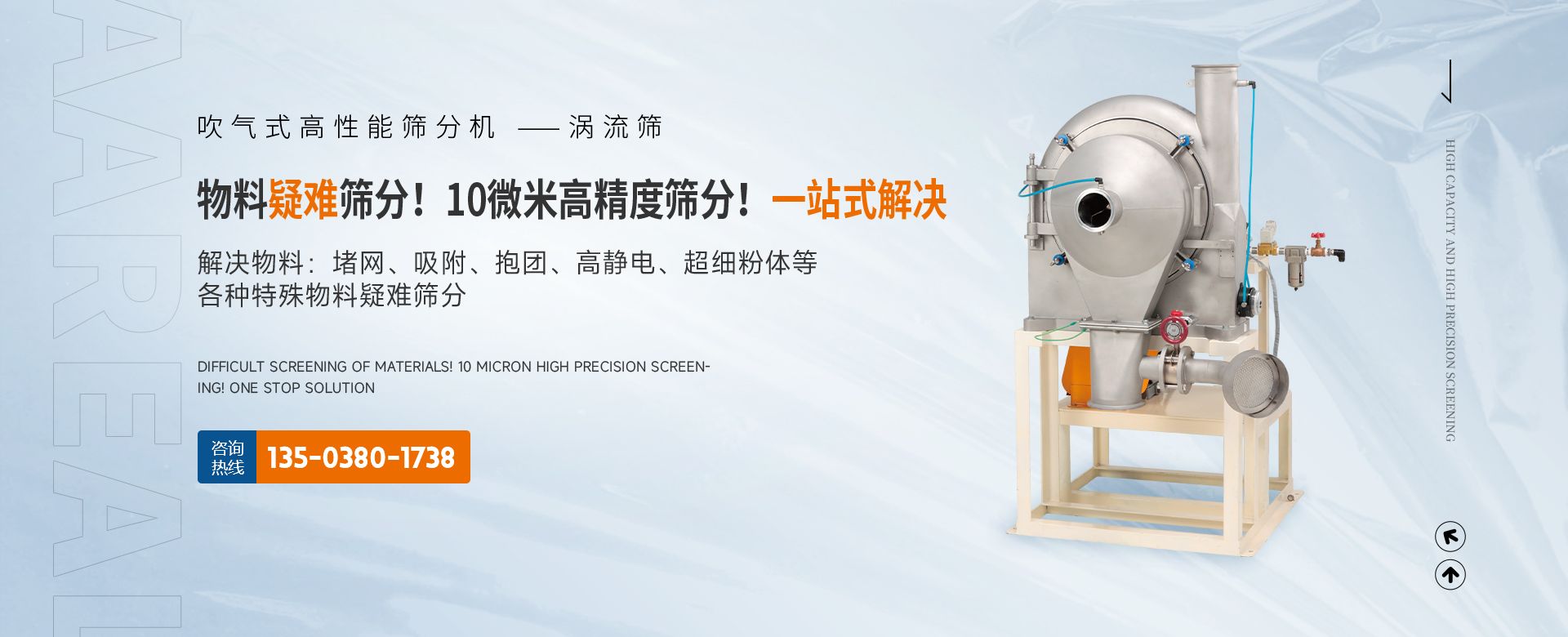 阿 瑞 爾(AAREAL)? 是從事篩分·過濾設備設計和制造的高新技術企業,擁有先進的生產設備、粉體篩分分析實驗室,在中國廣州市設辦事處。祝賀:新鄉市超大產能精細篩分技術工程中心在阿瑞爾(AAREAL)成立!!!在線大產能篩分和在線動態過濾是阿 瑞 爾(AAREAL)?的產品特點■ 在線大產能篩分,突破了傳統篩分觀念,工業化篩分,實現大產能、高能效篩分。以低故障率、低停機率、低使用成本、高產能、高精度、高能效為您帶來巨大意外收益。■ 阿瑞爾(AAREAL)擁有的回轉篩分技術,擁有的近百種篩分解決方案及上千種物料的篩分經驗,會給您展現全新的篩分設備,幫您實現大產能篩分 高精度篩分 疑難篩分。■ 阿瑞爾(AAREAL)的品質保證:阿 瑞 爾(AAREAL)? 是高品質篩分設備制造商高品質是阿 瑞 爾(AAREAL)? 質量準則。優品設備 合理篩分是阿 瑞 爾(AAREAL)?回報客戶的驗收標準。——我們不但擁有先進的生產設備,而且對于每一道工序,每一個細節,我們都要精工細作。對于客戶的每一個細微的問題,我們都要認真解決。——精心制作和用心服務是我們對客戶的責任。阿瑞爾(AAREAL)是您成功道路上值得信賴的、合作伙伴,以良好的質量、經驗和服務享譽多個國家,確保您安心地選擇每一件產品,阿瑞爾(AAREAL)竭誠與國內外商家雙贏合作,共同發展,共創輝煌!阿瑞爾(AAREAL)——您正確的選擇。